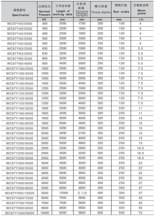 性能與特點:1.全鋼焊接結構,振動消除應力,機械強度高、剛性好。液壓上傳動,平穩(wěn)可靠。2.機械擋塊,扭軸同步,精度高。3.后擋料距離、上滑塊行程,電動調節(jié)、手動微調裝置、數(shù)字顯示。4.上模配有撓度補償機構,250噸和長度4000mm以上機床可采用下?lián)隙妊a償機構。